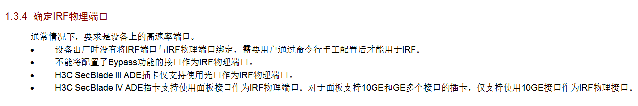 设备哪些端口可以作为IRF物理端口与设备的型号有关,请以设备的实际情况为准,其中万兆光口(面板标识为10GBASE-R,编号为XGE或Ten-GigabitEthernet开头)安装千兆光模块时,不建议将该接口配置为IRF物理端口。