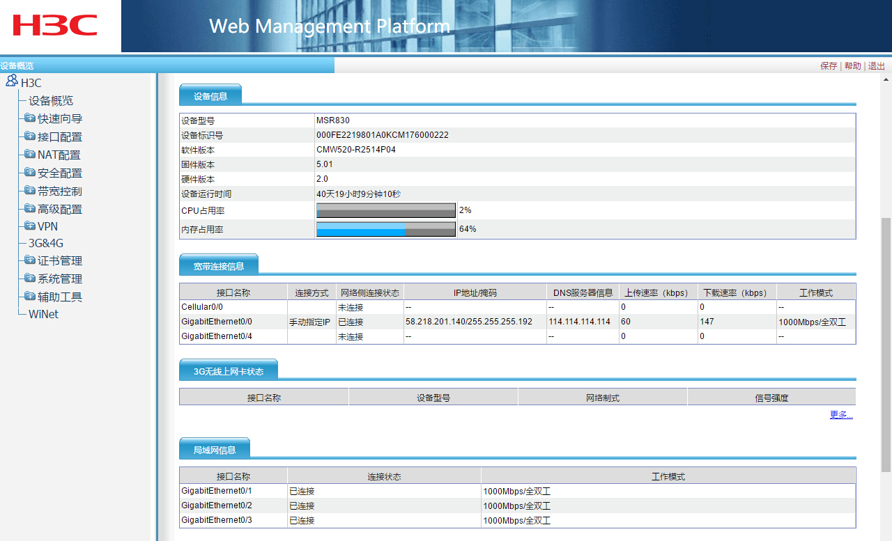 H3C MSR830通过静态IP配置的 路由器可以正常联网,