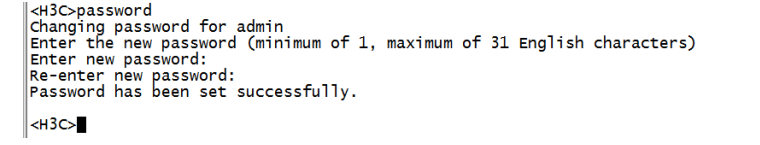 <H3C>提示进入设备命令行,输入password命令并回车,按照系统提示,提示:enter new password(输入新密码),则可以直接输入新密码,并重新输入一次确认即可。