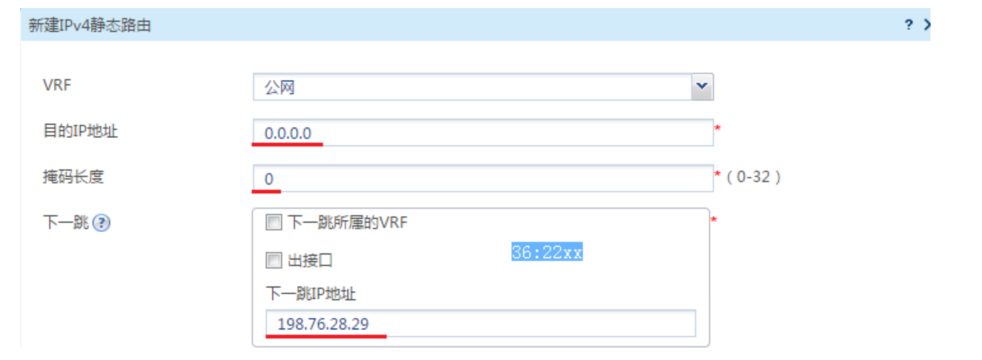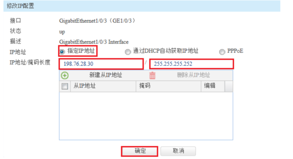 #“IP地址”填写运营商给的公网地址198.76.28.30,掩码为255.255.255.252。