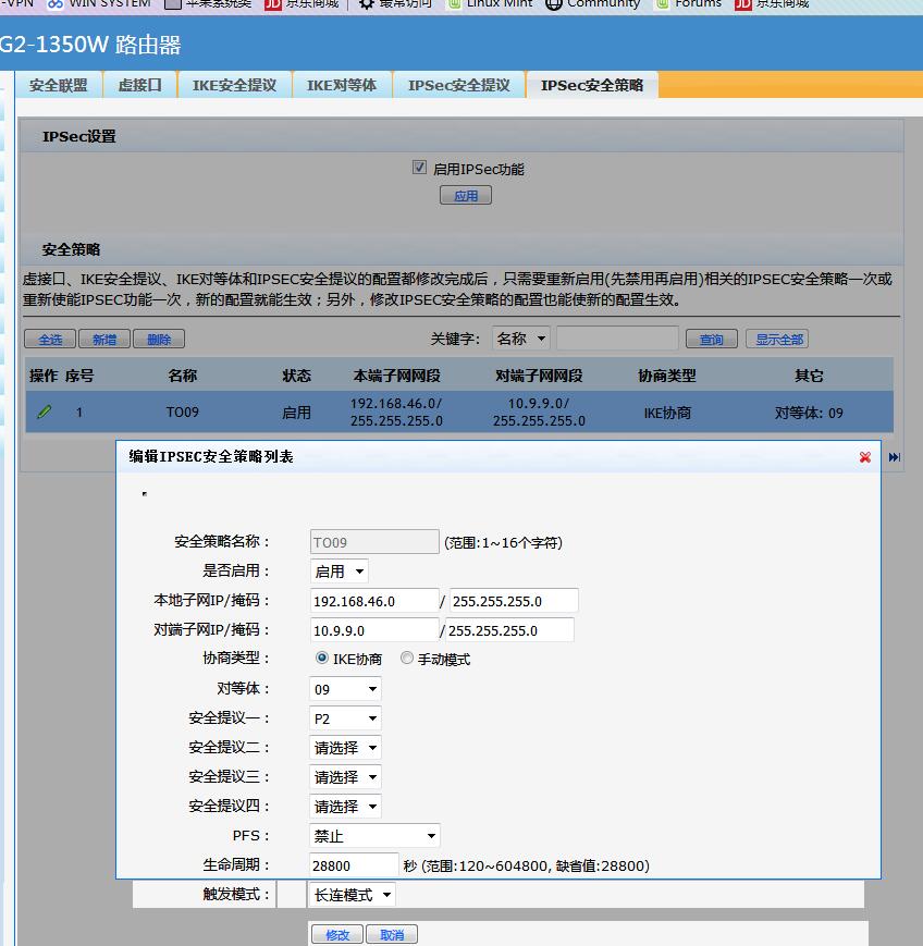 我看对面ISAKMP里面选的是DH1啊。如果这个地方没错,那就看看密钥有没有问题吧,其他配置没看出什么异常。