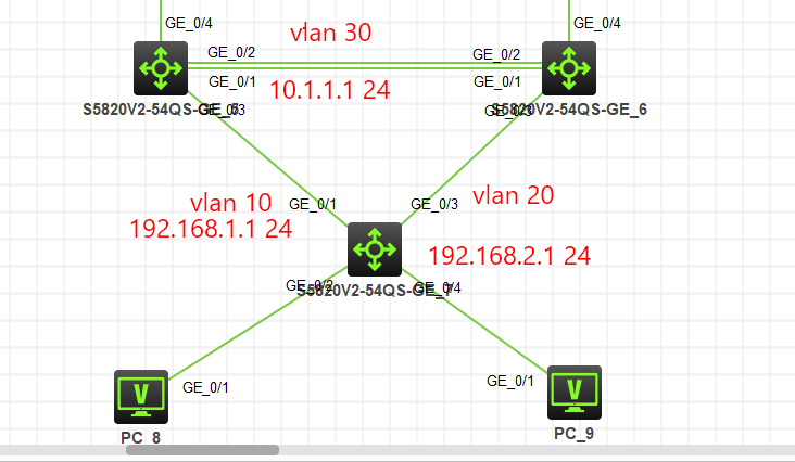现在只有192.168.1.1网段是通的。192.168.2.1不通。断开vlan10的线就通了。中间的交换机配置了VLAN10,加入1、2口,access。vlan 20加入3、4口,access。上边的路由器是链路聚合,access,,加入了vlan30。为啥PC只有vlan10那边是通的啊?断开vlan10,vlan20才能通