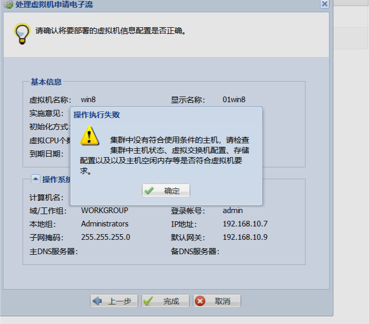 集群中没有符合使用条件的主机,请检查集群中主机状态、虚拟交换机配置、存储配置以及以及主机空闲内存等是否符合虚拟机要求。