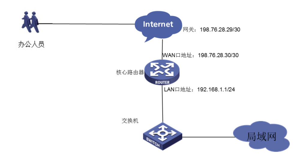 路由器采用固定IP地址的方式部署在公司互联网出口,运营商提供的IP地址为198.76.28.30/30,内网地址为192.168.1.1/24。公司外部办公人员需要通过拨号VPN连入公司内网