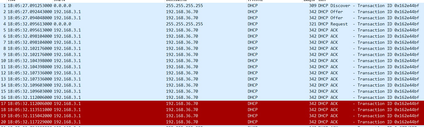 二层交换机开启DHCP SNOOPING后,路由器向客户端发ACK包时,交换机会把这个包又转发给路由器,然后路由器又转发给交换机,直到TTL超时。但是关闭DHCP SNOOPING 后,一切正常。