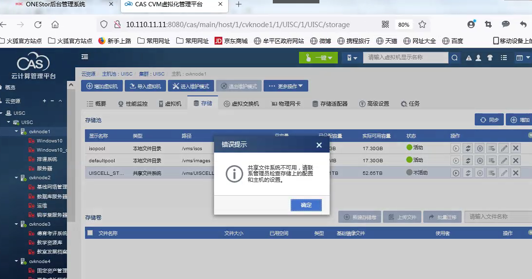 原因有很多,环境是否掉电了?可以先前台强制扫描下存储适配器,如果还是不行后台执行udevadm trigger然后重启多路径服务service multipath-tools restart。如果还是不能解决,CVK后台查看/var/log/ocfs2_shell_202110.log、syslog以及fsm(fsm新版本才有)日志。