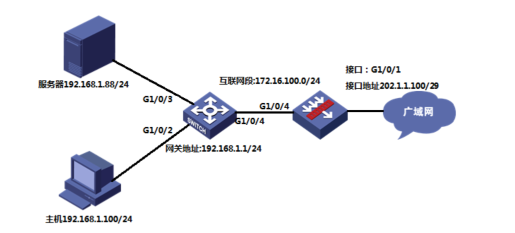 #在外网口GigabitEthernet1/0/1上配置内部服务器映射:允许外网用户通过公网地址202.1.1.100、端口8081访问内部服务器192.168.1.88的8081端口