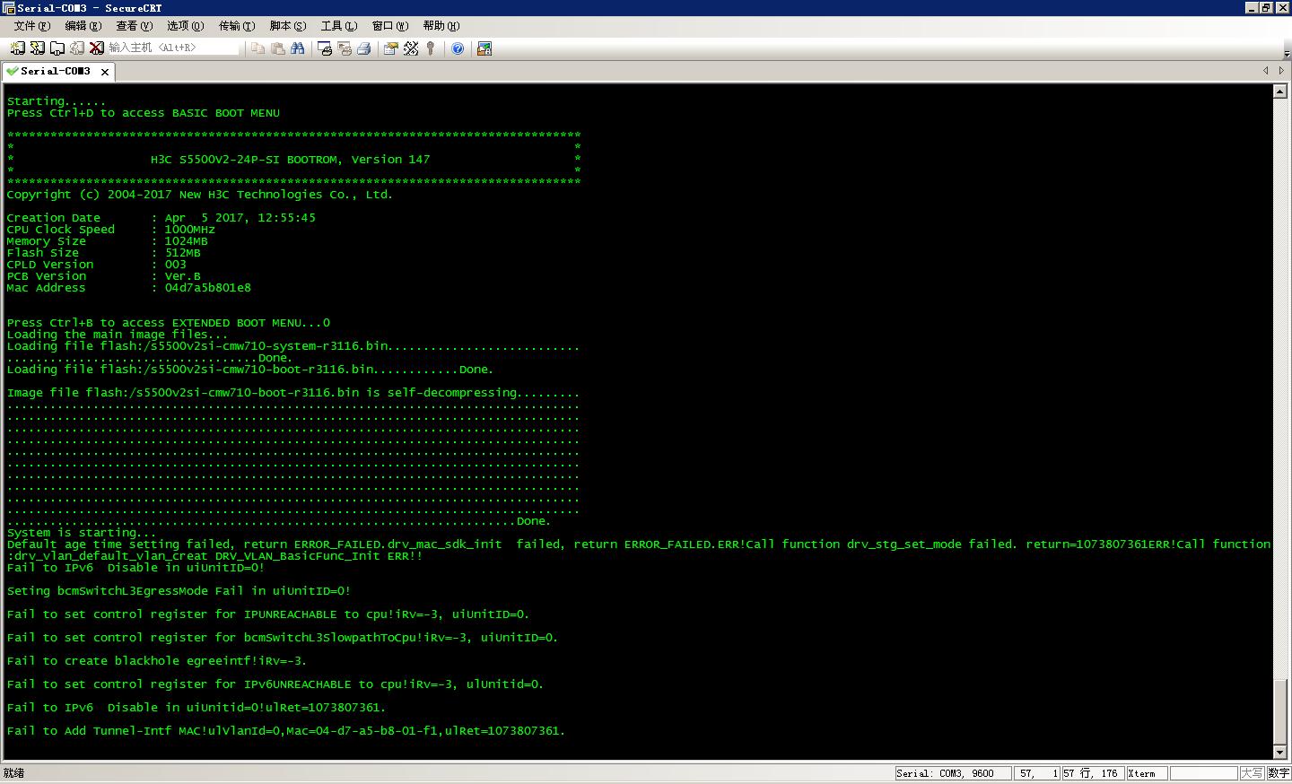 * H3C S5500V2-24P-SI BOOTROM, Version 147 * * * ******************************************************************************** Copyright (c) 2004-2017 New H3C Technologies Co., Ltd. Creation Date : Apr 5 2017, 12:55:45 CPU Clock Speed : 1000MHz Memory Size : 1024MB Flash Size : 512MB CPLD Version : 003 PCB Version : Ver.B Mac Address : 04d7a5b801e8 Press Ctrl+B to access EXTENDED BOOT MENU...0 Loading the main image files... Loading file flash:/s5500v2si-cmw710-system-r3116.bin........................... ...................................Done. System is starting... Default age time setting failed, return ERROR_FAILED.drv_mac_sdk_init failed, return ERROR_FAILED.ERR!Call function drv_stg_set_mode failed. return=1073807361ERR!Call function:drv_vlan_default_vlan_creat DRV_VLAN_BasicFunc_Init ERR!! Fail to IPv6 Disable in uiUnitID=0! Seting bcmSwitchL3EgressMode Fail in uiUnitID=0! Fail to set control register for IPUNREACHABLE to cpu!iRv=-3, uiUnitID=0. Fail to set control register for bcmSwitchL3SlowpathToCpu!iRv=-3, uiUnitID=0. Fail to create blackhole egreeintf!iRv=-3. Fail to set control register for IPv6UNREACHABLE to cpu!iRv=-3, ulUnitid=0. Fail to IPv6 Disable in uiUnitid=0!ulRet=1073807361. Fail to Add Tunnel-Intf MAC!ulVlanId=0,Mac=04-d7-a5-b8-01-f1,ulRet=1073807361.