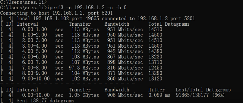 使用iperf3软件进行测试,其中一台电脑作为服务器,另一台电脑作为客户端进行收发UDP报文测试