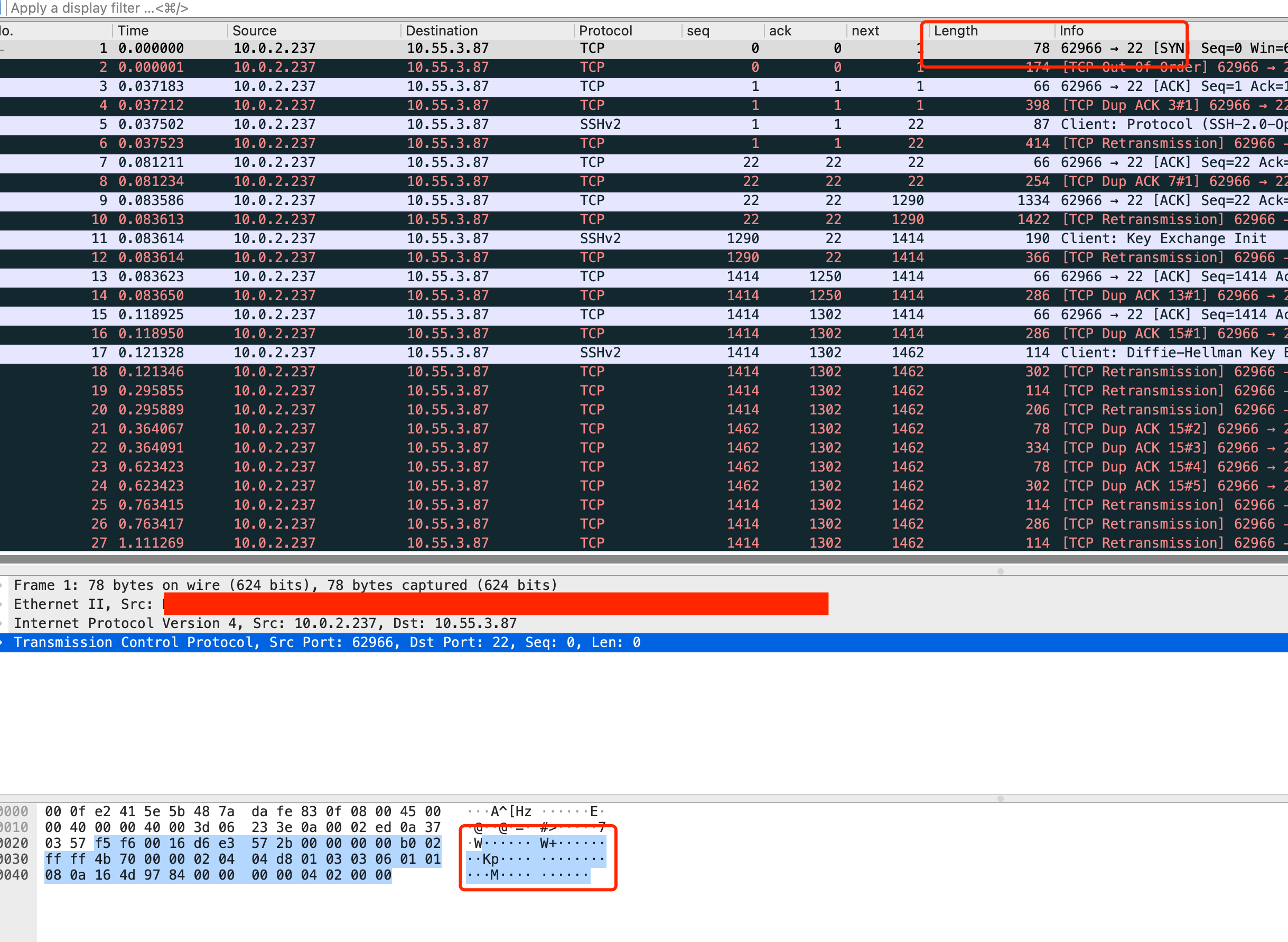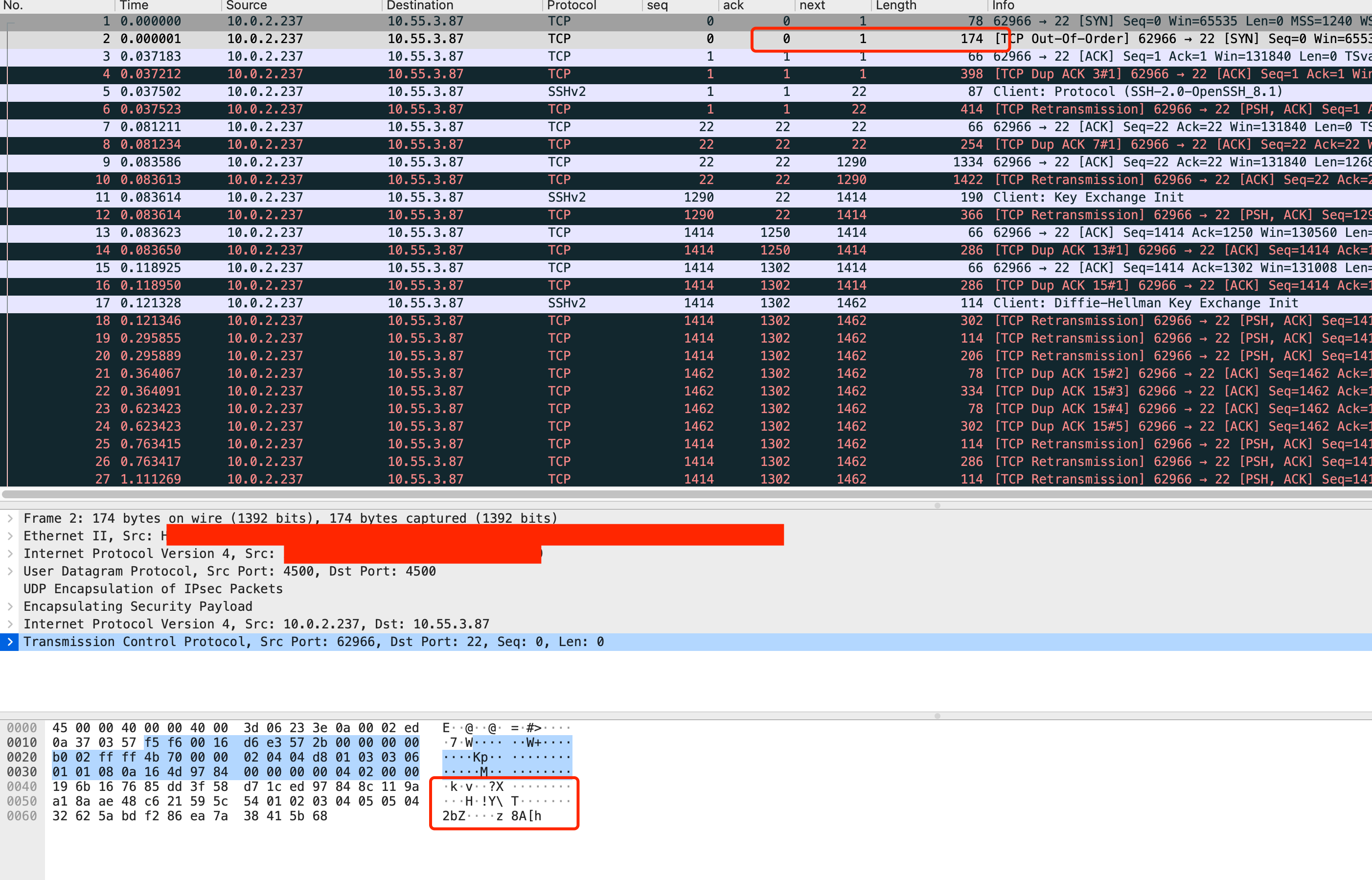 在与阿里云VPN网关链接的过程中,使用IKEv1模式没有出现问题,使用IKEv2模式发现ssh无法完成证书校验过程,抓包发现是某个ACK包阿里云里ECS无法收到,经与对方排查,发现包有上述异常从而被丢弃。