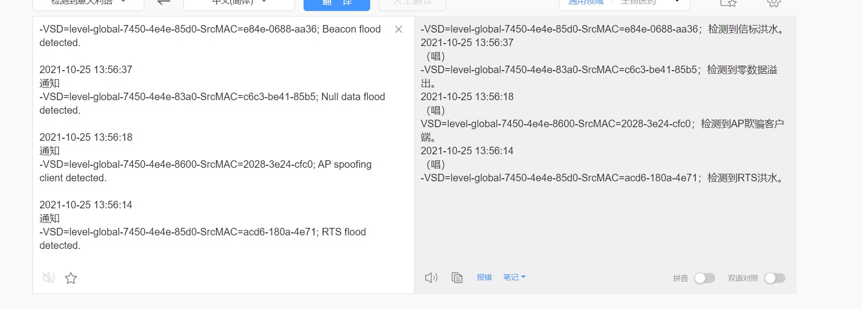 2021-10-25 13:56:18 通知 -VSD=level-global-7450-4e4e-8600-SrcMAC=2028-3e24-cfc0; AP spoofing client detected.