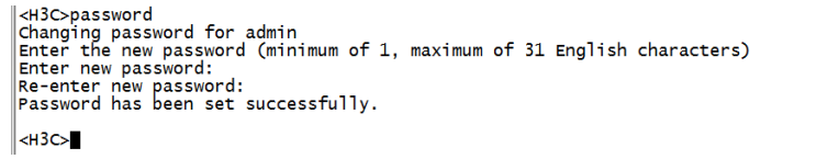 使用Consosle口登陆设备,参考【01设备管理】章节中的【1.1.1 Console方式登录设备方法】<H3C>提示进入设备命令行,输入password命令并回车,按照系统提示,提示:enter new password(输入新密码),则可以直接输入新密码,并重新输入一次确认即可。