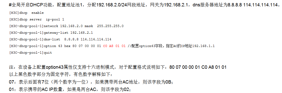 例如这个:[AC-dhcp-pool-vlan100] option 43 hex 80070000 01 C0A80A64