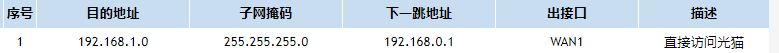 您好,首先目的地址是你访问的目的地址网段,这个是对的,其次检查掩码是否是255.255.255.0,最后就是下一跳地址,下一跳地址是光猫连接路由器接口的地址,是光猫的地址,不是路由器的地址