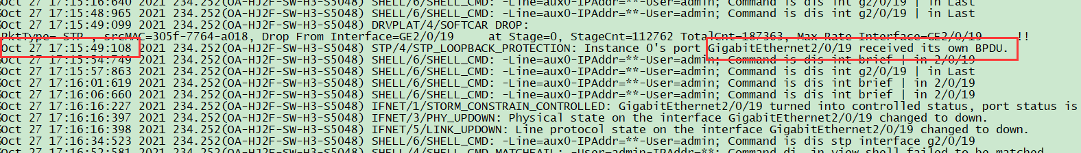 后来在G2/0/19端口上添加了stp loop-protection及storm-constrain配置,当G2/0/19环路时仍没有down,配置如下: