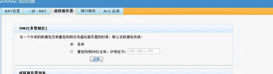 设置当虚拟服务器列表中如果不存在对应的映射项时,对报文的处理方式(主页面。选择“丢弃”或“重定向到DMZ主机”,单击<应用>按钮生效) | |