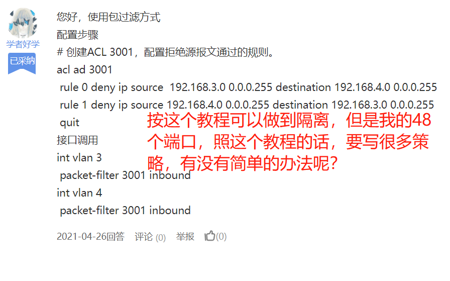 如何做到三层网络层隔离呢,ACL我看了教程,可以做到,但是48个valn要写太多策略了,