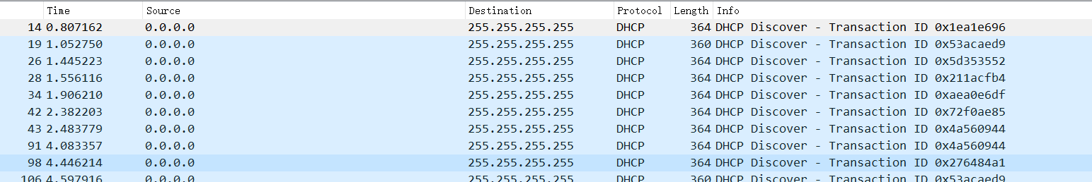 查看抓包是终端一直发送请求,没有收到dhcp服务器回应。