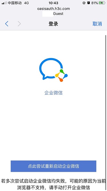 企业微信已经是打开的,这个地方跳转不过去,导致认证失败,无法上网。