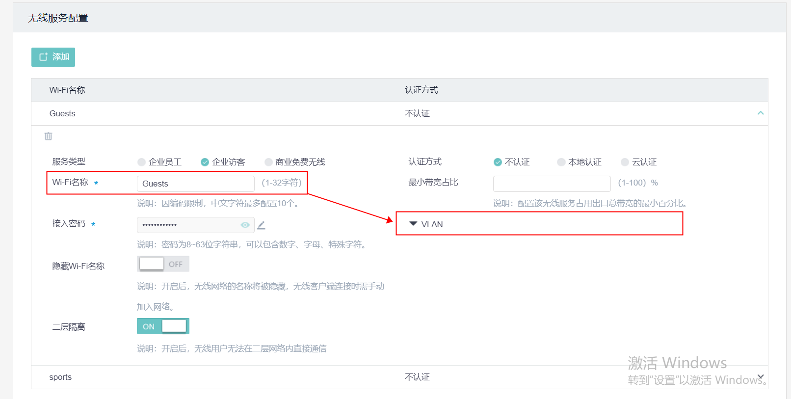 在小贝的WEB页面中,是不是需要将guests、sports和对应的vlan8和vlan7做绑定?