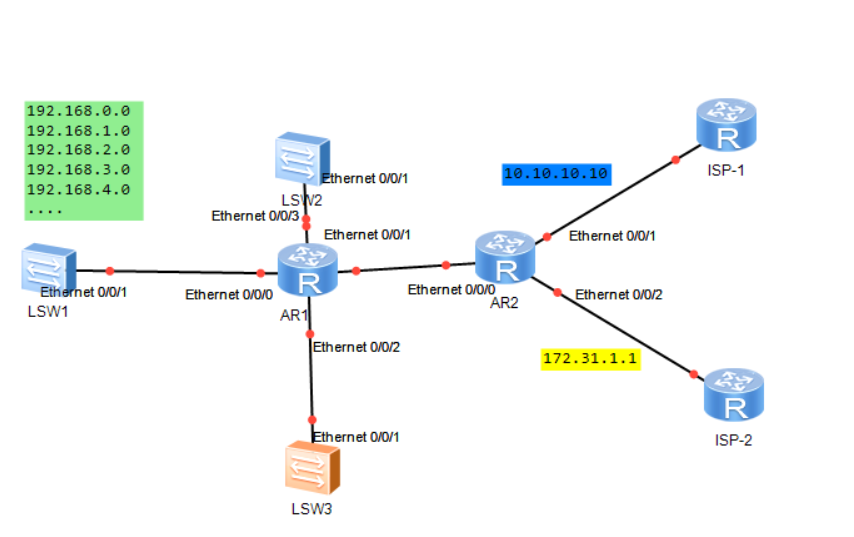 如下图,SW1里面有本地192.168.0-4.0/24等网段,希望指定到ISP-1的网络 10.10.10.10出口出去,出口路由器R2本身运营商1-2口做了负载分担,可以通过什么方式保证SW1接入R1的端口R1-ETH0/0/0 上面的报文全部从ISP-1的出口出去呢?或者指定SW1里的某些网段从ISP-1出口出去?