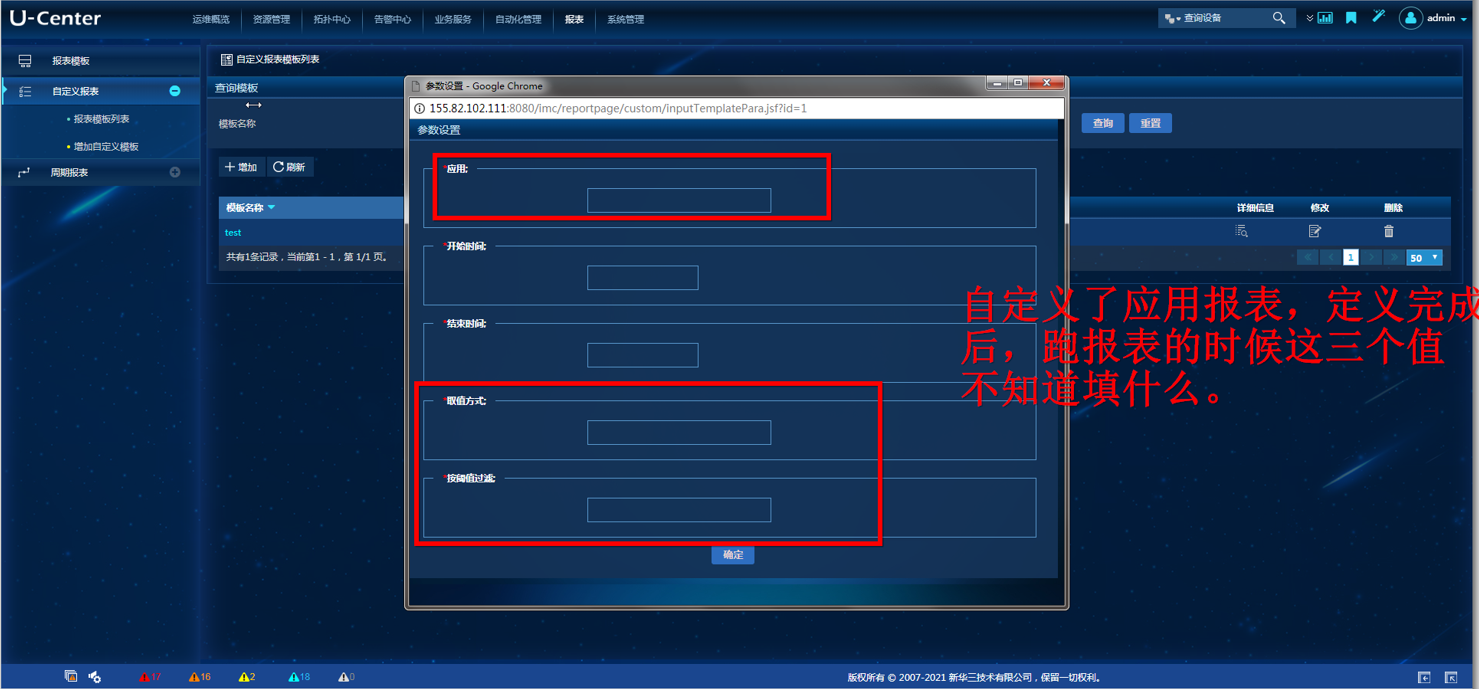 在UCenter中的自定义报表里面配置了自定义应用报表功能,在运行自定义应用报表时需填写如下如的参数,应该怎么填写?