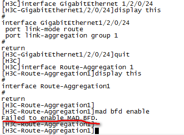 两台s7506e搭建irf,使用三层聚合接口进行bfd mad检测。创建了一个三层聚合接口,也成功将以太网端口加入聚合组。但在三层聚合接口下mad bfd enable时提示failed to enable mad bfd。请问怎么解决?