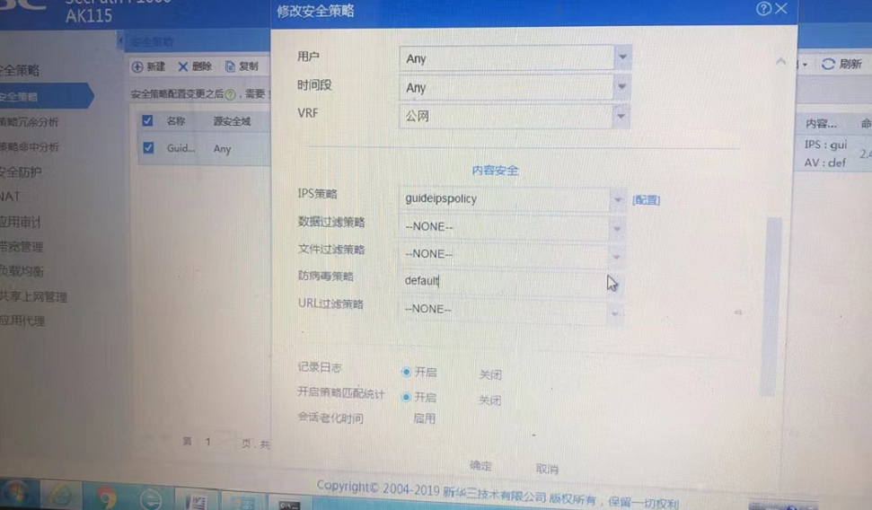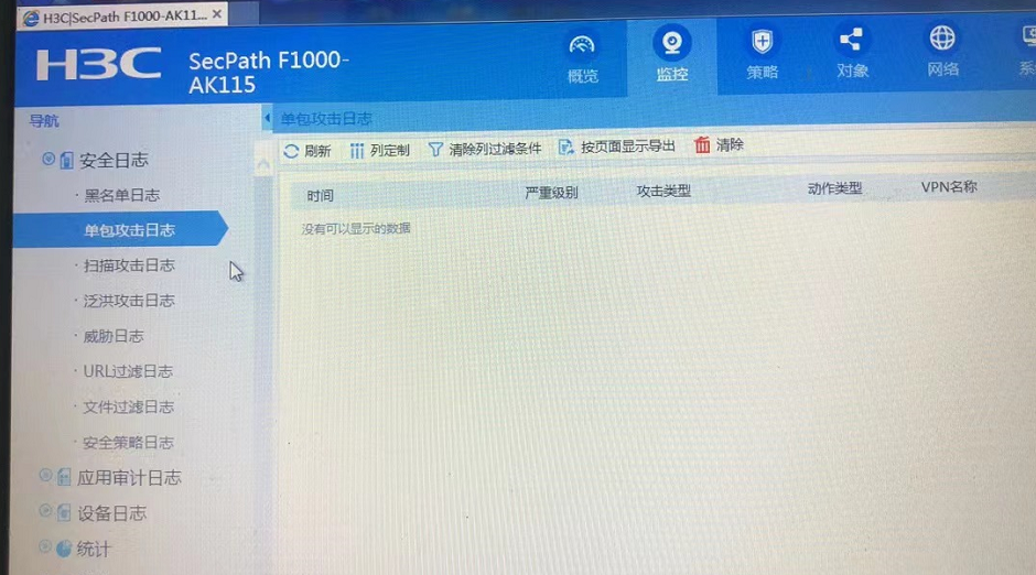 安全策略只能控制你定义的安全区域之间的通信,不能防止单包攻击这类东西啊,那个要配置安全防护才有用。如果是要看IPS的记录,在威胁日志里。当然,如果本来就没有攻击的话就什么日志都没有了。