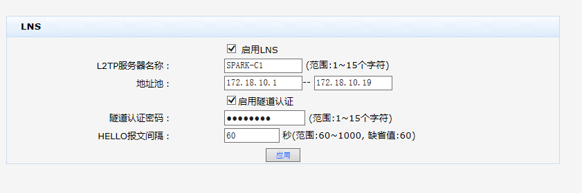 配置LNS信息(启用LNS,输入L2TP服务器名称:H3C-LNS,地址池:10.10.11.10~10.10.11.20,单击<应用>按钮生效) | |