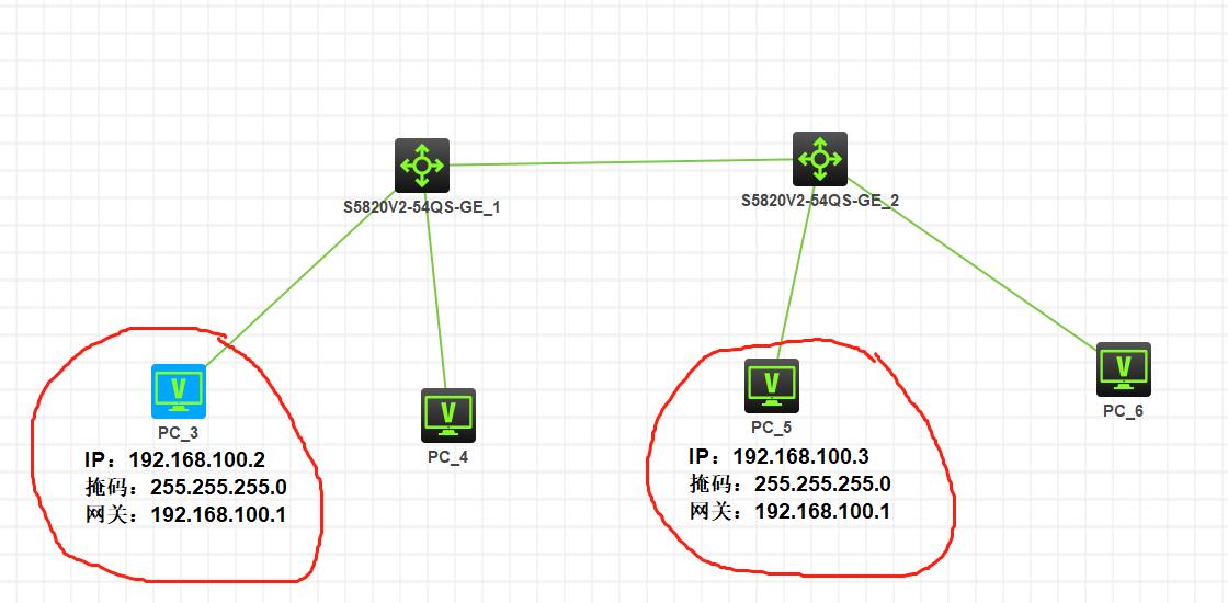 如图所示PC3和PC5两台电脑分别接在两台S5820V交换机的GE1/0/2接口,两台交换机通过GE1/0/1连接,从pc3上PING192.168.100.3网络不通。