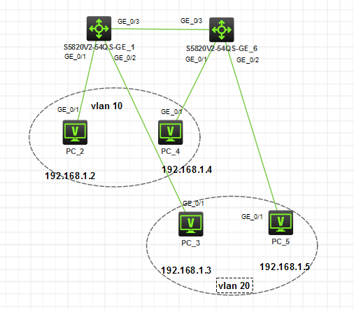 2、拓扑所示IP,均为同网段设备,交换机无配置vlan的意义,若使用跨设备互通(跨网段不互通)则无需配置配置网关,在两台设备上,放通相同的vlan即可