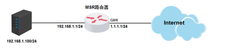 将内网服务器映射到公网,使得公网侧的用户可以通过MSR路由器的WAN接口+端口号来访问内网的WEB服务器,本案例中,服务器的服务端口为80,服务器内网地址为192.168.1.100,路由器外网地址为1.1.1.1,映射的外网端口为8080。