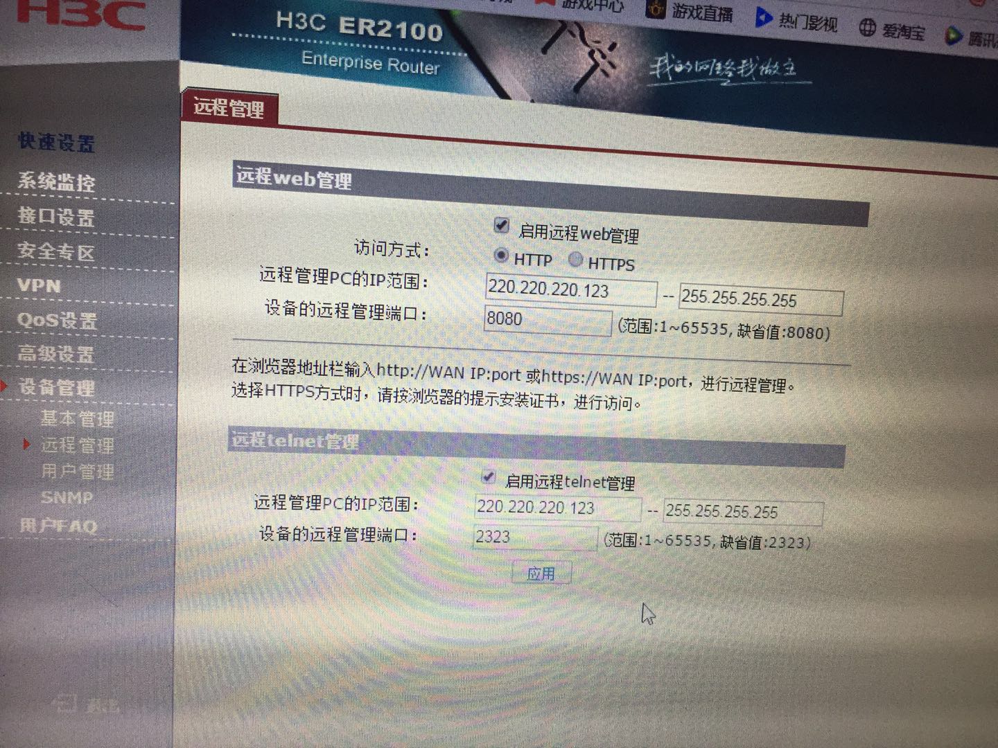 这个只要点击启用远程管理,记下管理端口就可以了,远程管理ip地址的范围,最好不要填,比如你填了220.220.220.123,当你远程连接路由器时,你的pc机的地址,只能是220.220.220.123这个地址,或者如果通过路由器代理上网,路由器的地址只能是220.220.220.123,启用telnet管理的话,用处不大,选不选都行,这个很简单,选中启用远程web管理,点击访问方式http,这两项就行了,其他都用默认就可以