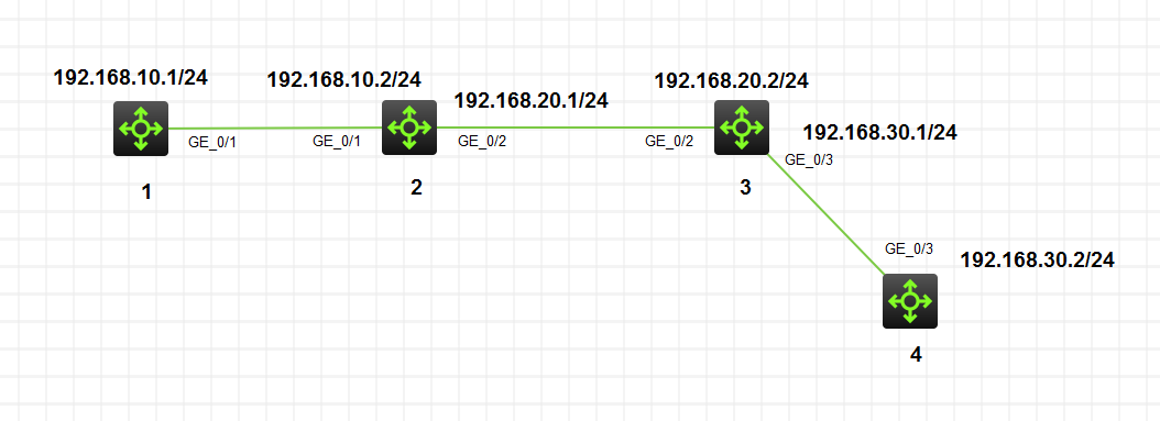 1设备 ospf 1 router-id 1.1.1.1 area 0.0.0.0 network 192.168.10.0 0.0.0.255 2设备 ospf 1 router-id 2.2.2.2 area 0.0.0.0 network 192.168.10.0 0.0.0.255 area 0.0.0.1 network 192.168.20.0 0.0.0.255 3设备 ospf 1 router-id 3.3.3.3 area 0.0.0.1 network 192.168.20.0 0.0.0.255 area 0.0.0.2 network 192.168.30.0 0.0.0.255 4设备 ospf 1 router-id 4.4.4.4 area 0.0.0.2 network 192.168.30.0 0.0.0.255 设备的接口IP省略