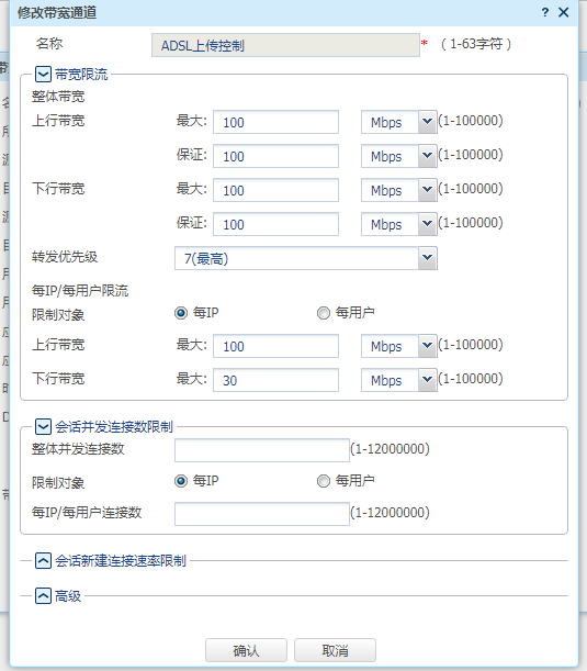做了带宽限速正常上网下载速度能到100M,上传速度能到30M,带宽策略一应用下载速度变成了30M左右正常的但是上传速度只有0.2M左右