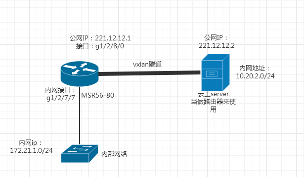 要求:实现msr5680下的内网能访问到云上服务器下面的内部网络,通过vxlan隧道, 前期解决的问题,云上linux server这台服务器做为路由器来使用,本端机房这边内网拿一台linux服务器主机与之做隧道,能互通,成功,但是迁移到用路由器与云上server做隧道的时候总是不行,查看了官方文档,不能理解