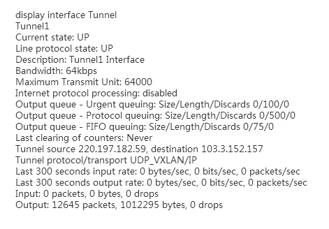 感谢你的回答,公网地址之间是互通的 ,loopback不通 对端是一台linux的服务器,不是路由器,前期做过本端linux主机和云上的linux主机之间做vxlan是可以互通的没问题, 尝试用路由器和对端的linux服务器对接出问题,tunnel 的源和目的都是使用的公网地址 这个配置没错,不要纠结上面的IP地址,编的 。下面是我dis出来的情况: <H3C>display interface Tunnel Tunnel1 Current state: UP Line protocol state: UP Description: Tunnel1 Interface Bandwidth: 64kbps Maximum Transmit Unit: 64000 Internet protocol processing: disabled Output queue - Urgent queuing: Size/Length/Discards 0/100/0 Output queue - Protocol queuing: Size/Length/Discards 0/500/0 Output queue - FIFO queuing: Size/Length/Discards 0/75/0 Last clearing of counters: Never Tunnel source 221.12.12.1, destination 221.12.12.2 Tunnel protocol/transport UDP_VXLAN/IP Last 300 seconds input rate: 0 bytes/sec, 0 bits/sec, 0 packets/sec Last 300 seconds output rate: 0 bytes/sec, 0 bits/sec, 0 packets/sec Input: 0 packets, 0 bytes, 0 drops Output: 12645 packets, 1012295 bytes, 0 drops <D-50-N-0005>display l2vpn vsi verbose VSI Name: vpna VSI Index : 0 VSI State : Up MTU : 1450 Bandwidth : - Broadcast Restrain : - Multicast Restrain : - Unknown Unicast Restrain: - MAC Learning : Enabled MAC Table Limit : - MAC Learning rate : - Drop Unknown : - Flooding : Enabled VXLAN ID : 43 Tunnels: Tunnel Name Link ID State Type Tunnel1 0x5000001 Up Manual ACs: AC Link ID State GE1/2/7/7 0 Up 您再帮我看看嘛,谢谢谢谢!