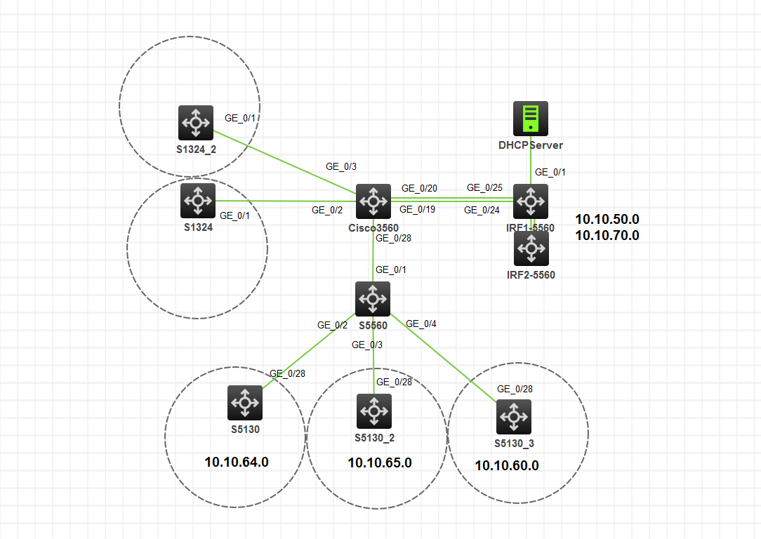 如下图,新加入3台设备5130x3,上联一台S5560设备,要帮下面三台划分vlan且能访问到服务器。