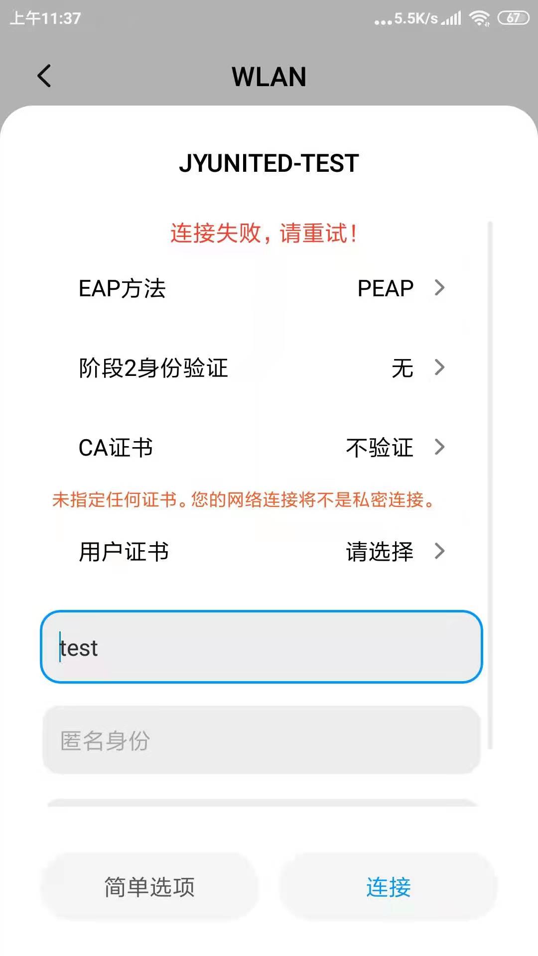 %Nov 13 11:26:48:250 2021 JGM-C3MR1C-WX-H3510 DOT1X/5/DOT1X_WLAN_LOGIN_FAILURE: -Username=test-UserMAC=508f-4c53-450b-BSSID=38ad-8ecb-7e94-SSID=JYUNITED-TEST-VLANID=60; A user failed 802.1X authentication