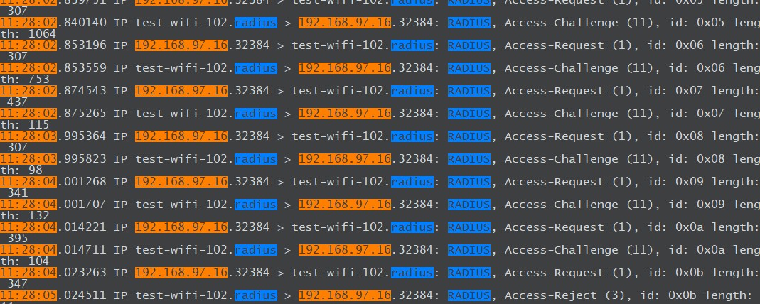 %Nov 13 11:26:54:864 2021 JGM-C3MR1C-WX-H3510 STAMGR/6/STAMGR_CLIENT_SNOOPING: Detected client IP change: Client MAC: 508f-4c53-450b, IP: 192.168.41.251, -NA-, -NA-, -NA-, Username: -NA-, AP name: ap-gm-2, Radio ID: 2, Channel number: 149, SSID: HSHC-Office, BSSID: 38ad-8ecb-7e90. %Nov 13 11:27:24:078 2021 JGM-C3MR1C-WX-H3510 DOT1X/5/DOT1X_WLAN_LOGIN_FAILURE: -Username=test-UserMAC=94db-c937-e746-BSSID=38ad-8ecb-7ea4-SSID=JYUNITED-TEST-VLANID=60; A user failed 802.1X authentication.