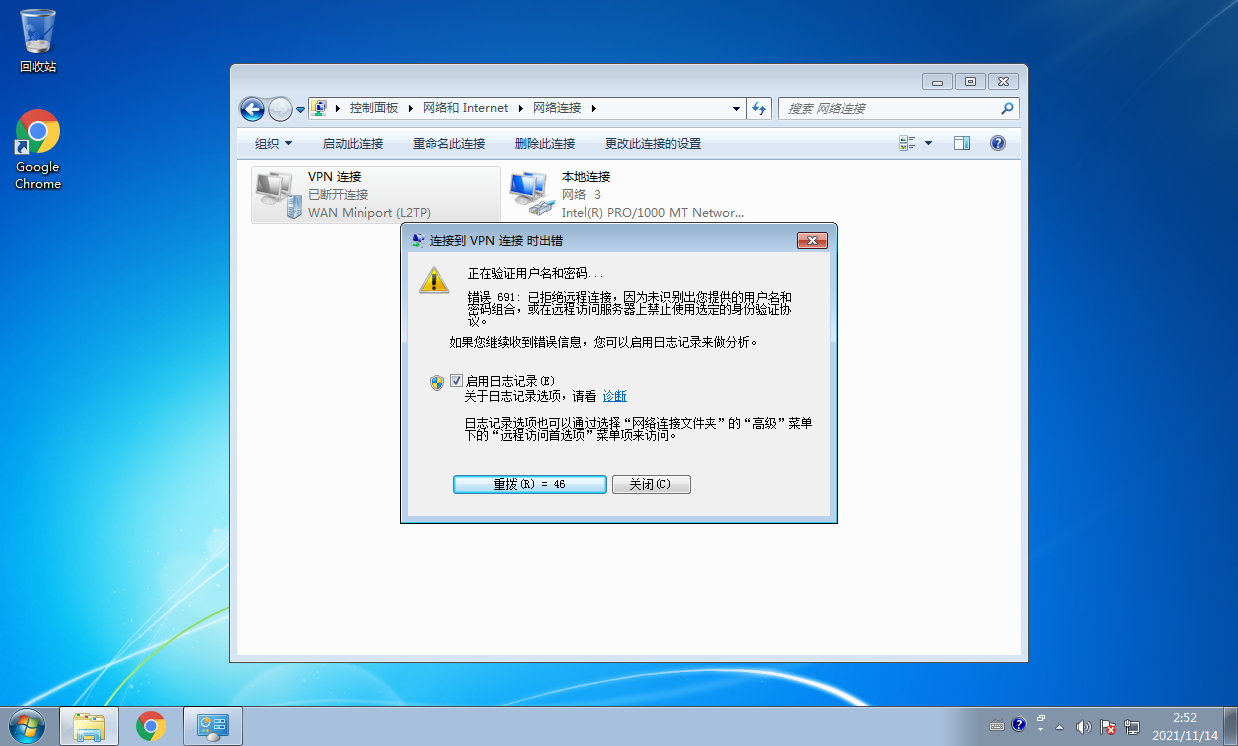 在B网络,一台windows 7电脑,通过私有地址接入互联网,现在想在这个电脑上通过pppoe连接到A网络的VPN上,却总是提示错误691。