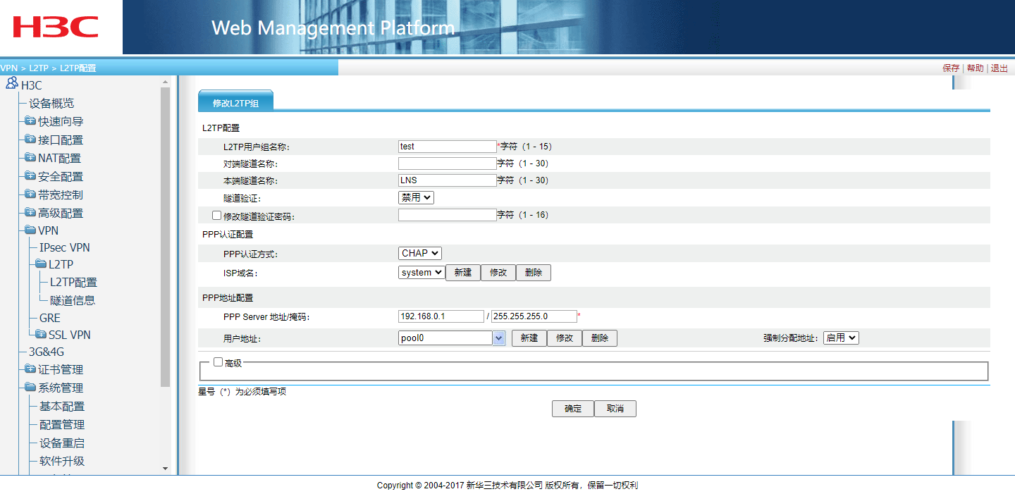 在A网络,MSR830在giga0/0端口采用pppoe上网,获得动太公网地址,在这个路由器上开启L2TP服务,配置方法如照搬http://www.h3c.com/cn/d_201108/723698_30005_0.htm。
