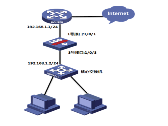 如下组网图所示,在原有的网络中增加防火墙来提高网络安全性,但又不想对原有网络配置进行改动,所以需要防火墙采用透明模式部署;其中GigabitEthernet 1/0/1接口接原有路由器的下联口,GigabitEthernet 1/0/3接口接原有的交换机上联口。