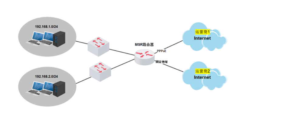 MSR路由器双WAN口上网,WAN口1采用静态地址,地址为1.1.1.1(网关1.1.1.254),WAN口2采用PPPoE拨号上网,拨号口为Dialer 1。内网有两个网段,VLAN1网段为192.168.1.0/24,VLAN2网段为 192.168.2.0/24,网关都设置在MSR路由器上(VLAN1的网关为192.168.1.1,VLAN2的网关为192.168.2.1)。需要实现192.168.1.0/24网段通过拨号口WAN2上网,192.168.2.0/24网段通过固定地址接口WAN1上网。