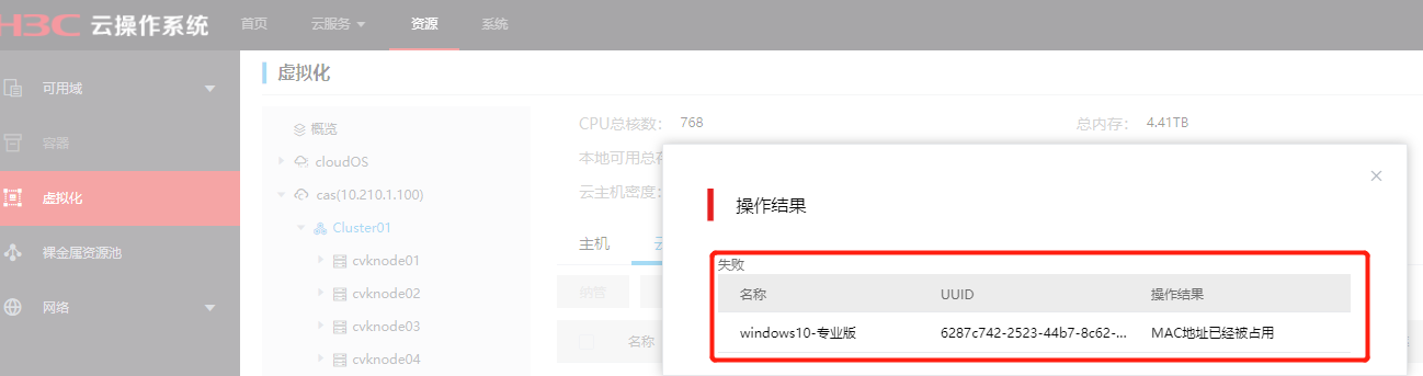 纳管CAS得主机时,提示“MAC地址被占用”
