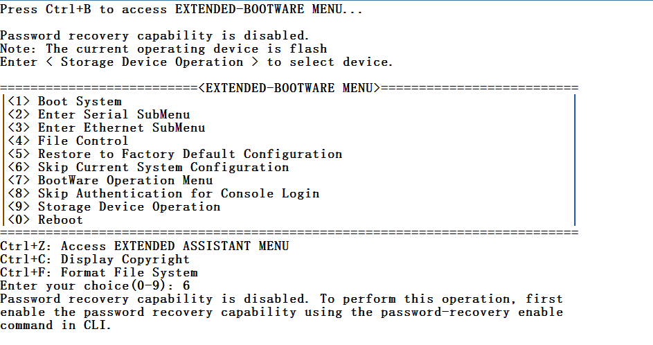选8进入系统然后在系统视图下,使用命令password-recovery enable使能密码恢复功能(默认使能)。