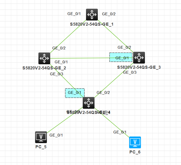 PC划分各自的vlan10/vlan20,并设置网关实现不同vlan之间的通信,确保SWC的G1/0/1接口为堵塞端口、SWD的G1/0/1为堵塞端口。