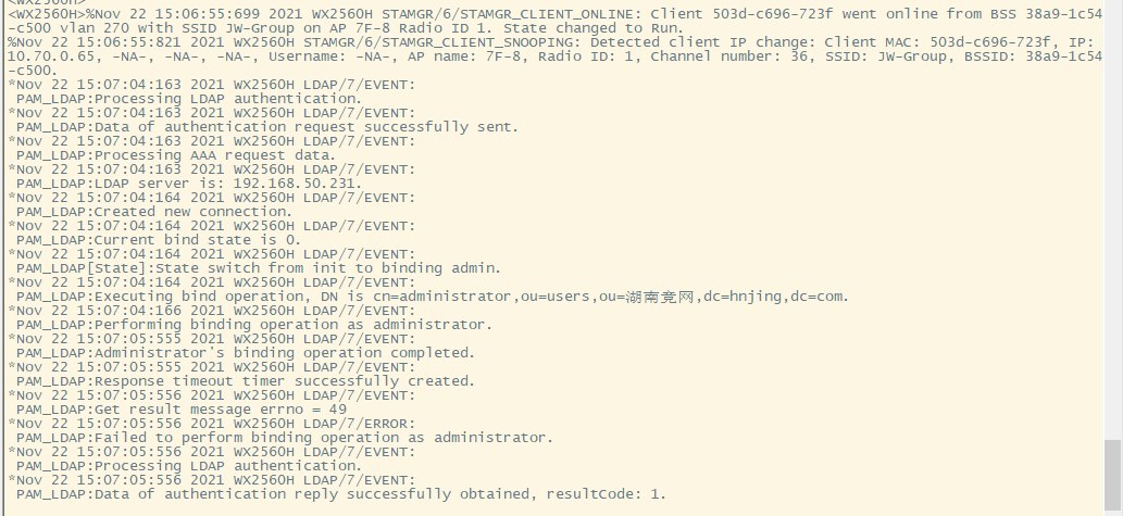 从error来看,管理员执行绑定操作失败,应该是LDAP服务器上配置有误,导致客户端无法认证成功