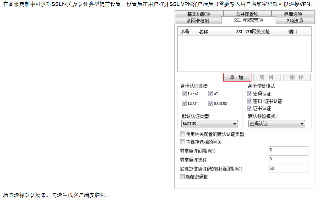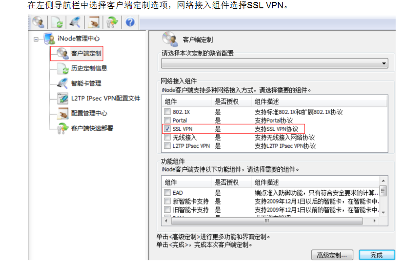 iNode管理中心定制时勾选“SSL VPN”功能后就OK了,到时生成的安装包里就有SSL VPN的连接功能了