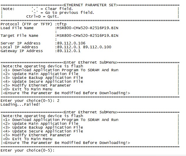 路由器是同CRT目前无法登陆,在使用3CD上传对应的升级文件包后,通过CRT进行升级操作,升级过程中出现升级失败 loading.........faild!
